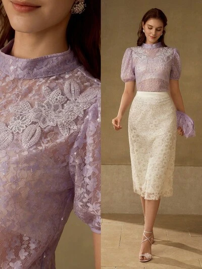 Luźna bluzka z koronkowym haftem motyli, wiązana na szyi, stylowa i wszechstronna-46%