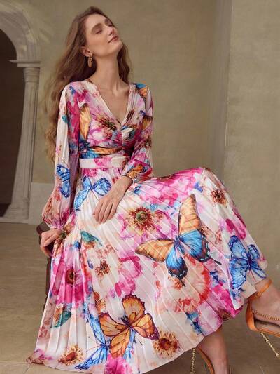 DAMSKA SUKIENKA Z MOTYLAMI I KWIATAMI, DŁUGA, PLISOWANA, Z DEKOLTEM W SEREK, Z RĘKAWAMI LATARNIANYMI-38%