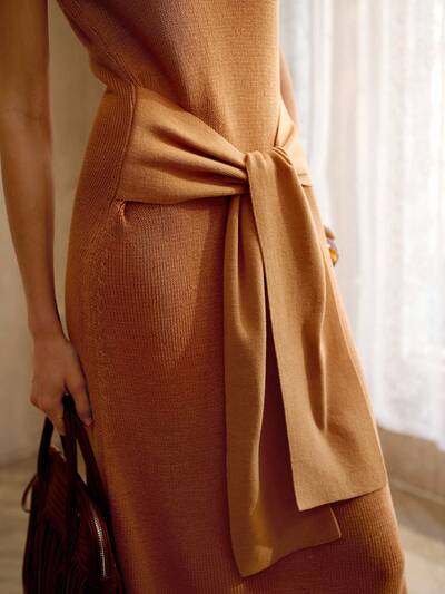 DZIANINOWA SUKIENKA MIDI W STYLU VINTAGE BEZ RĘKAWÓW Z TKANYM PASKIEM, MINIMALISTYCZNY DESIGN, WIOSNA/LATO-43%