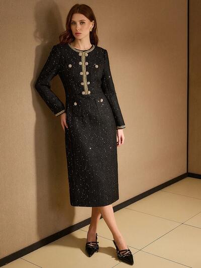 Sukienka midi z tweedowymi cekinami, kontrastową taśmą, kryształkami i detalami ze sztucznych pereł