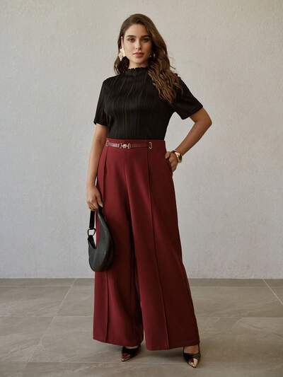 Spodnie z szeroką nogawką i metalową klamrą w dużym rozmiarze, zdobione paskiem ze sztucznej skóry