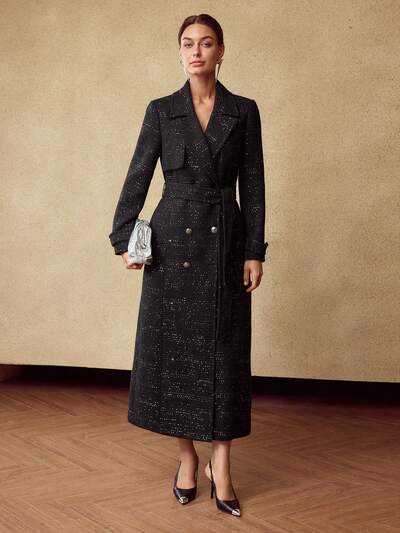 DAMSKI DŁUGI TRENCZ Z TWEEDU Z BELKAMI, JESIEŃ/ZIMA-68%