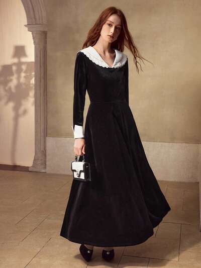 Aksamitna sukienka z kontrastowym kołnierzykiem i mankietami o rozszerzanym dołem-65%