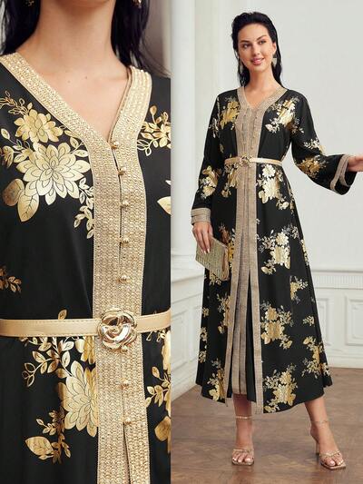 VESTIDO COM DECOTE V COM IMPRESSÃO DE PLANTAS E BARRA DIVIDIDA-34%
