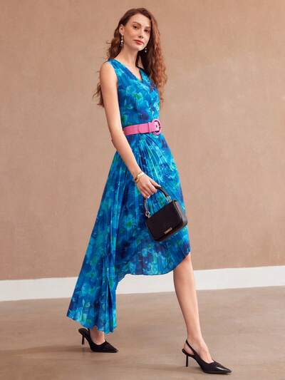 Vestido Floral Tecido Plissado Com Borda Assimétrica Para Mulheres-46%