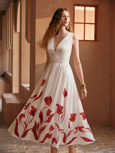 VESTIDO MIDI FEMININO SEM MANGAS COM BORDADO E CINTO, ELEGANTE PARA ENCONTROS, PRIMAVERA/VERÃO-38%