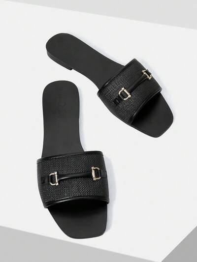 SANDÁLIAS PLANAS FEMININAS DE COR SÓLIDA COM BIQUEIRA QUADRADA E DECORAÇÃO DE REBITE-67%
