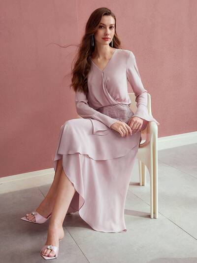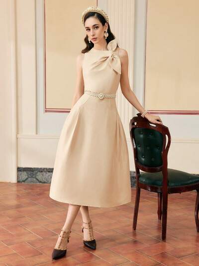 ZEYLAH VESTIDO MIDI MULHERES COM PREGAS DOBRADAS, LAÇO DECORATIVO, VESTIDO DE FESTA, VESTIDO DE CETIM-23%