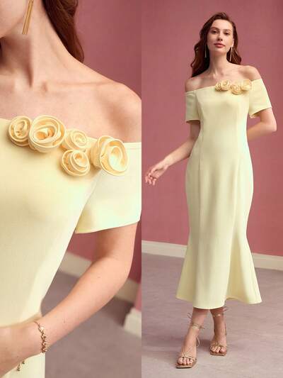 VESTIDO DE OMBRO CAÍDO FLORAL ESTÉREO, ROUPA PARA O DIA DOS NAMORADOS-23%