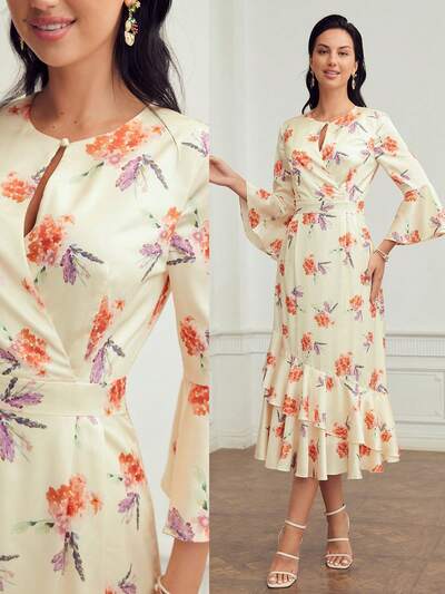 VESTIDO FLORAL DE MANGA EVASÊ COM DECOTE KEYHOLE, MANGAS COMPRIDAS, ACABAMENTO COM BABADOS EM CAMADA-23%