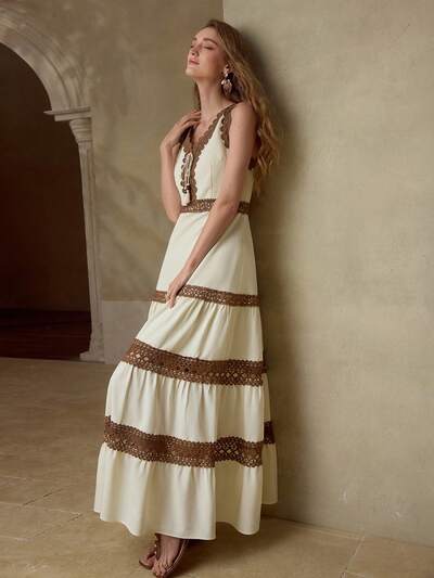 VESTIDO COM BAINHA DE FOLHO EM RENDA CONTRASTANTE-46%
