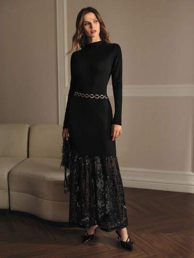 VESTIDO SLIM FIT SEM CINTO COM GOLA ALTA CONTRASTANTE, LANTEJOULAS, TULE TRANSPARENTE E BAINHA FRANZIDA-23%