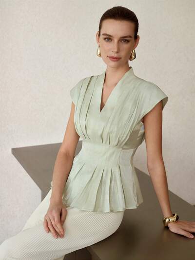 Top FEMININA SEM MANGAS COM DECOTE EM V, CINTURA MARCADA, TECIDO BRILHANTE SEMELHANTE A LINHO, ELEGANTE, ADEQUADA PARA O TRABALHO, PRIMAVERA/VERÃO-36%