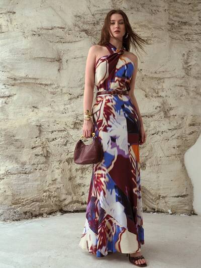 REGATA FEMININA DE DECOTE EM V, CINTURA MARCADA, BARRA ASSIMÉTRICA, ESTAMPA DE LINHO, PRIMAVERA/VERÃO-62%