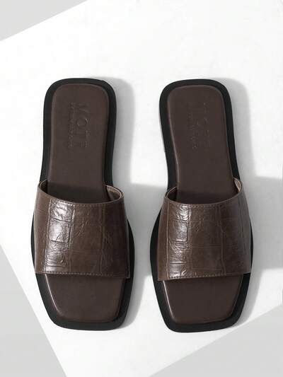 Sandálias Casuais Leves e Confortáveis, Estilo Simples e Versátil, Couro PU Marrom com Estampa de Pedra, Bico Quadrado e Aberto, Sola Plana, Ideal para Praia