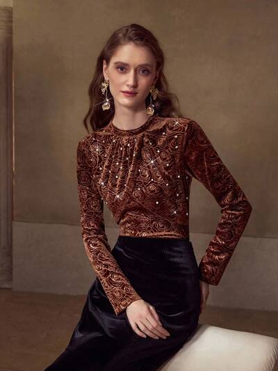 CAMISETA CASUAL ELEGANTE FEMININA COM APLICAÇÃO DE STRASS E FLORAL DE ROSA VELUDO-66%