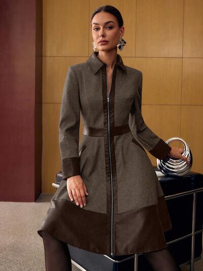 NOVO CASACO ELEGANTE DE OUTONO PARA MULHERES, CINTURA MARCADA COM RETALHOS DE COURO PU-66%