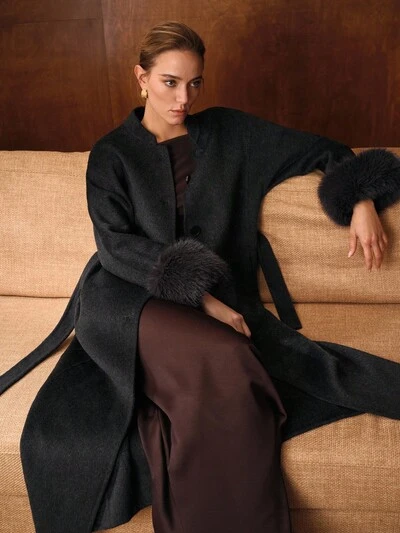 ELEGANTE CASACO LONGO DE LÃ REVERSÍVEL COM GOLA DESTACÁVEL DE PELE, OUTONO/INVERNO-25%