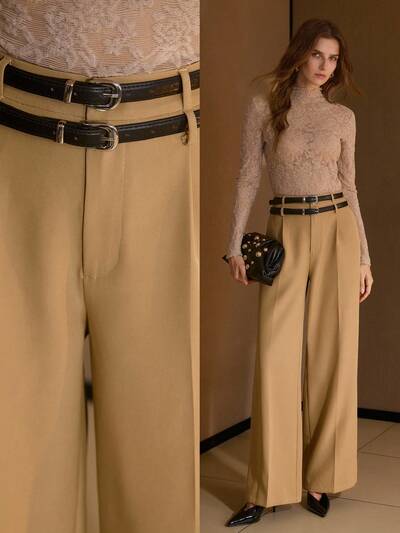 CALÇA SOCIAL FEMININA DE PERNA LARGA COM DETALHE DE FIVELA E COSTURA FRONTAL EM MISTURA DE LÃ ESPINHA DE PEIXE-21%