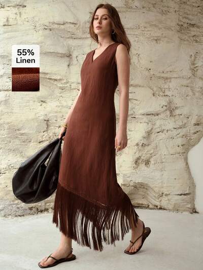 VESTIDO MIDI COM DECOTE EM V SEM MANGAS, MISTURA DE LINHO COM BORLAS